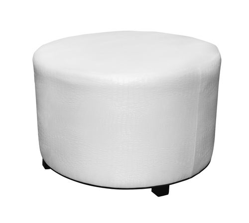 Smooth, modern round shape in white faux leather/vinyl. Works as a clean and versatile accent piece.