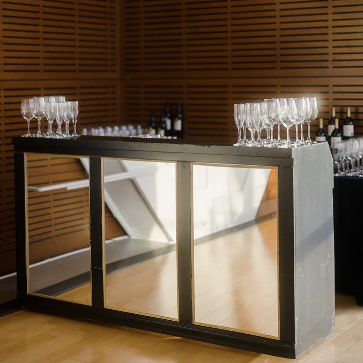 Sleek and stylish, our Black Bar with Mirror Inserts is a contemporary statement piece perfect for weddings, parties, and corporate events. The glossy mirror panels add depth and reflection, while the bold black frame provides a modern edge. Both functional and eye-catching, this bar creates a polished focal point in any event space.