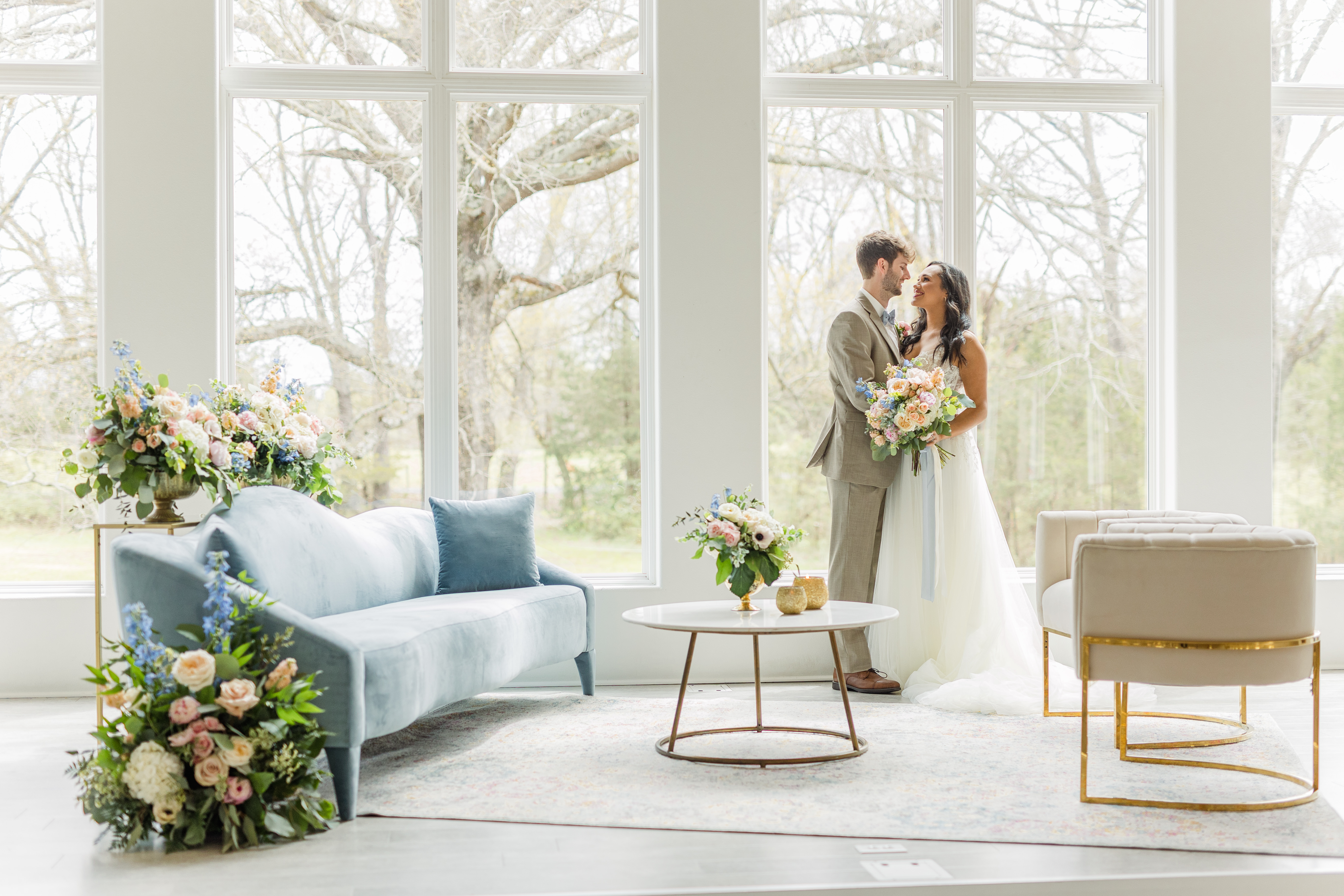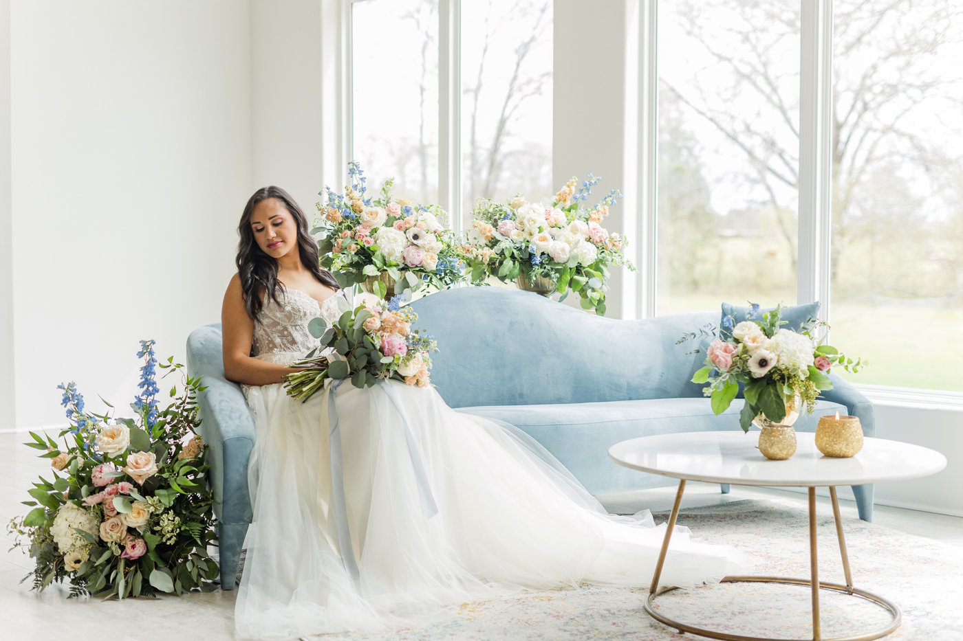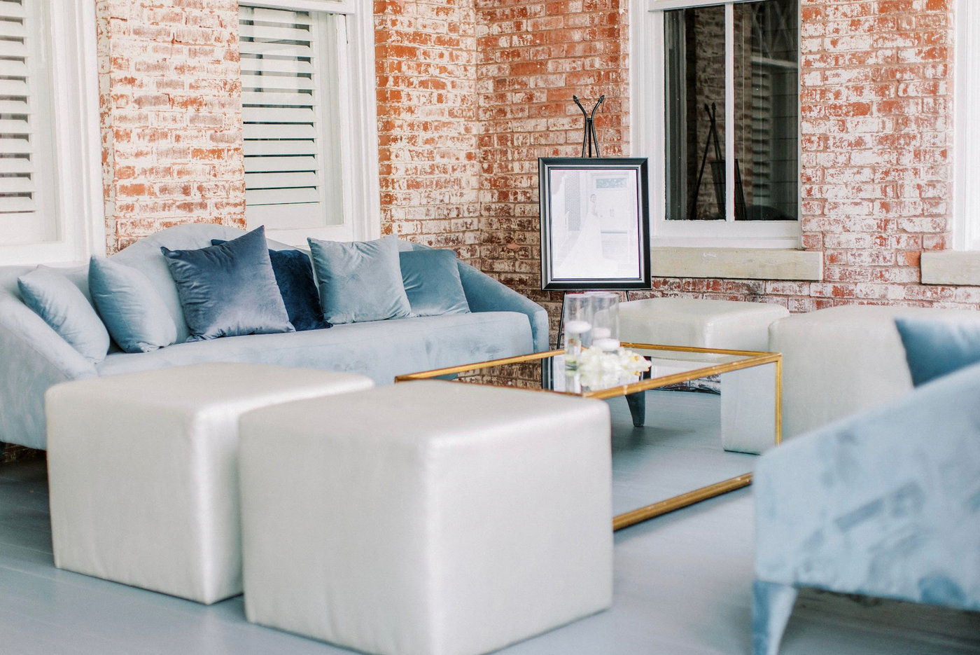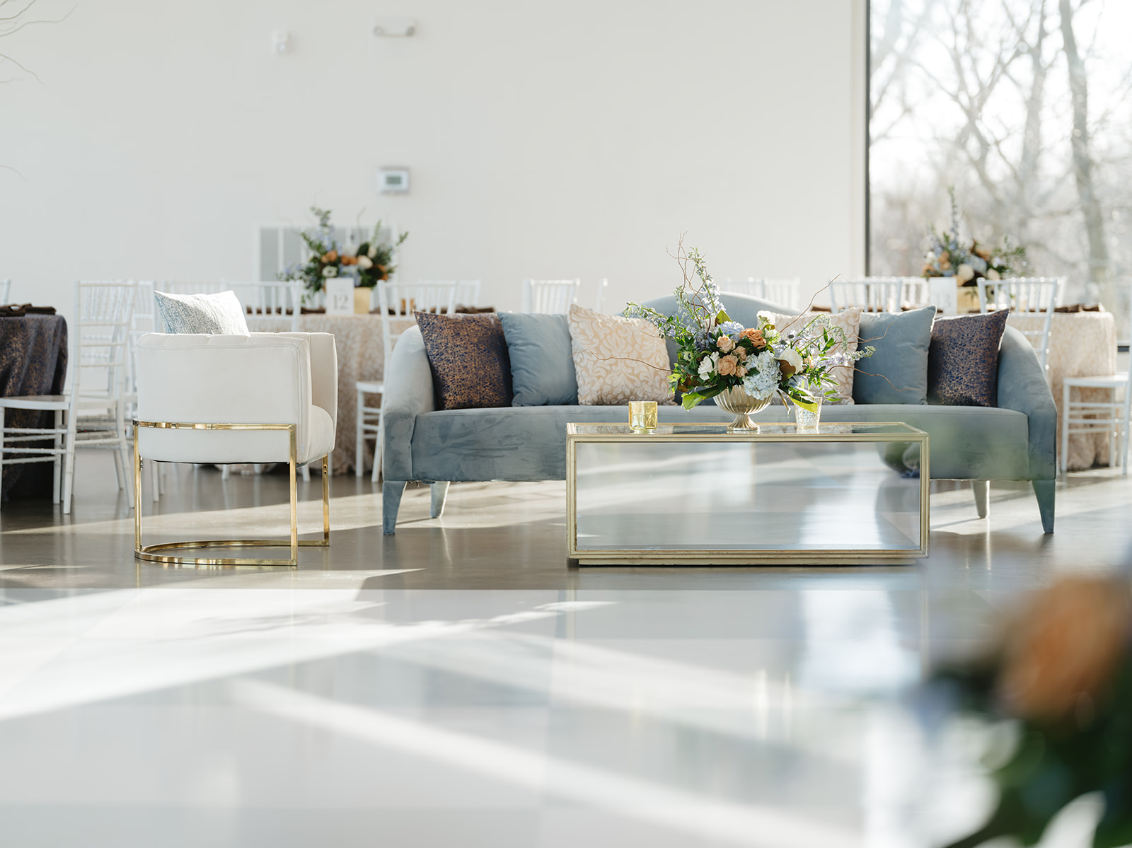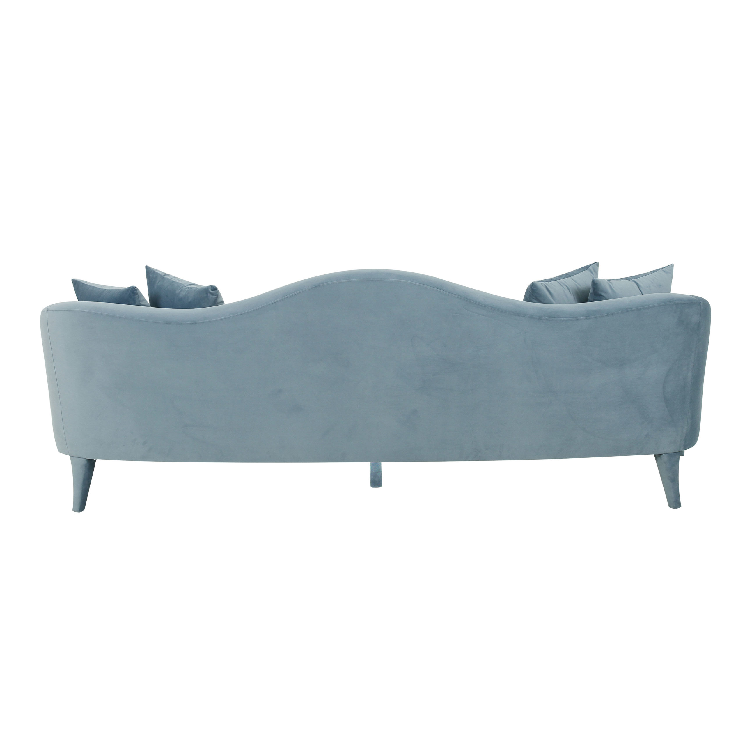 A romantic sofa upholstered in soft blue velvet with a subtle arched back. The delicate curves and included throw pillows make it a graceful focal point for event lounges, adding both comfort and charm.