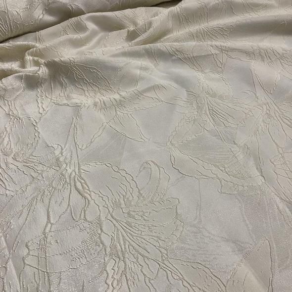 This designer fabric is a jacquard material with a metallic embroidered floral design throughout.