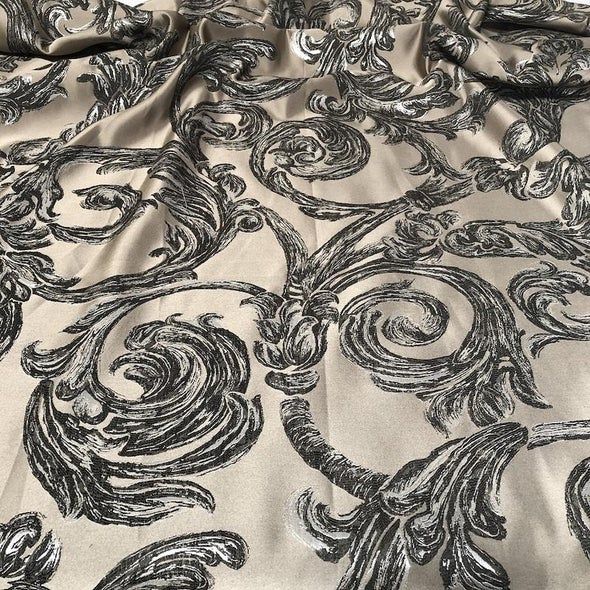 This designer fabric has a polyester base with metallic embroidered design in a "Florence" pattern and has a multi tone color throughout.