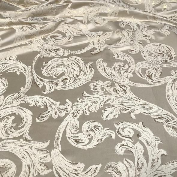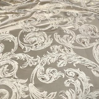 This designer fabric has a polyester base with metallic embroidered design in a "Florence" pattern and has a multi tone color throughout.