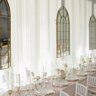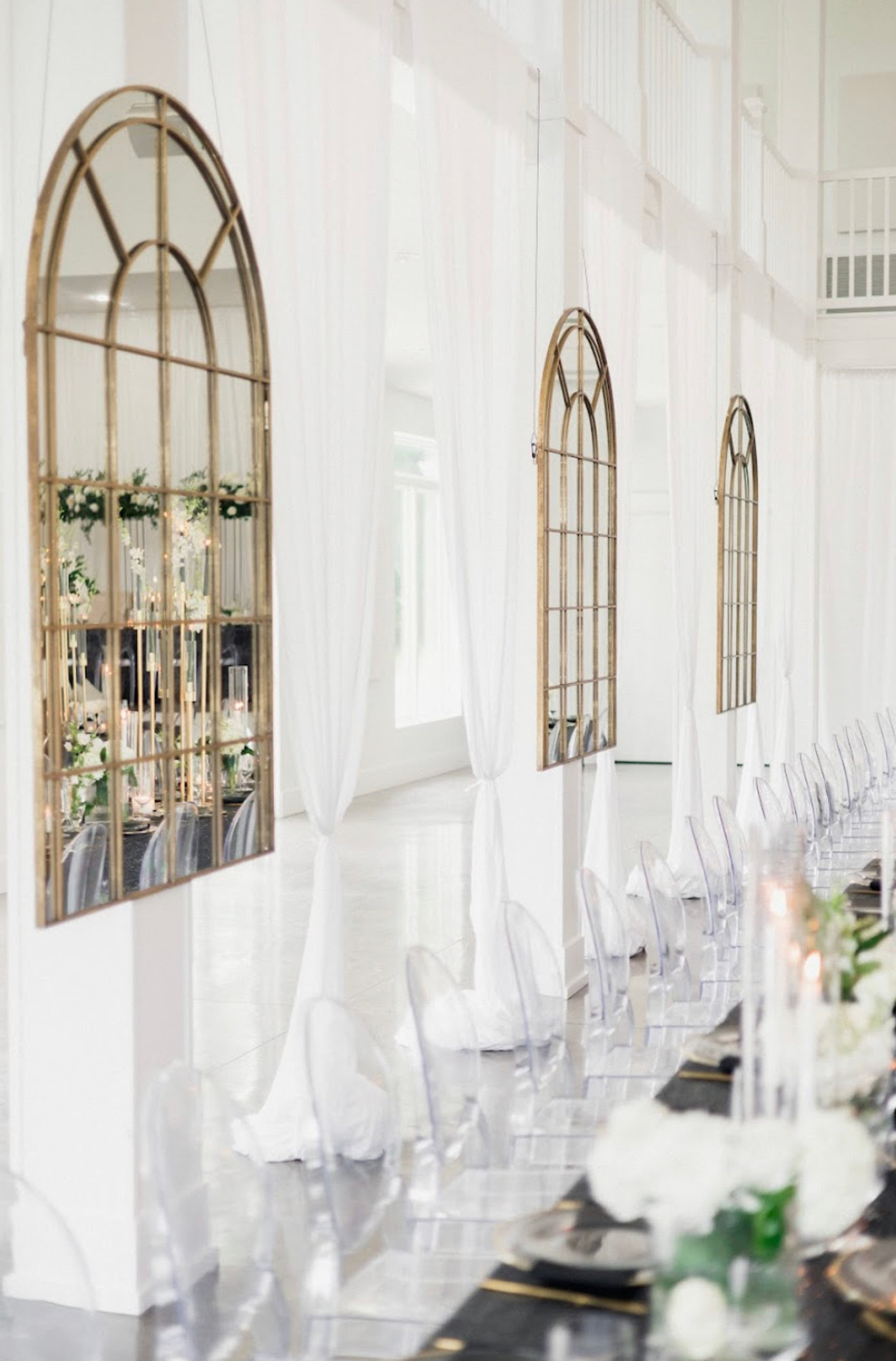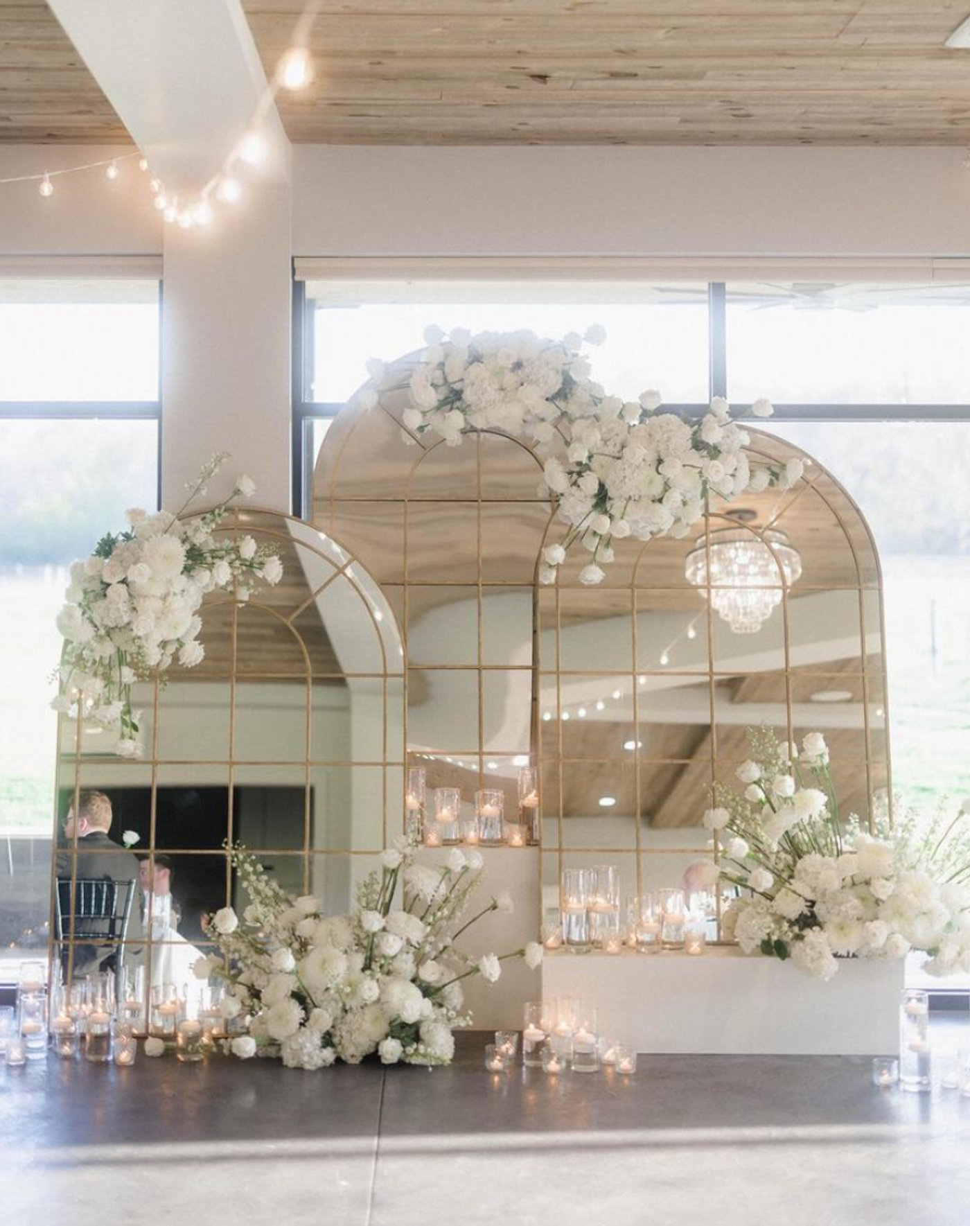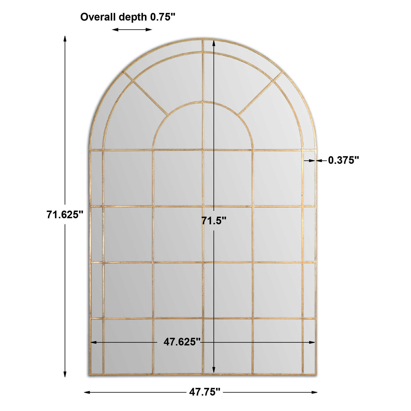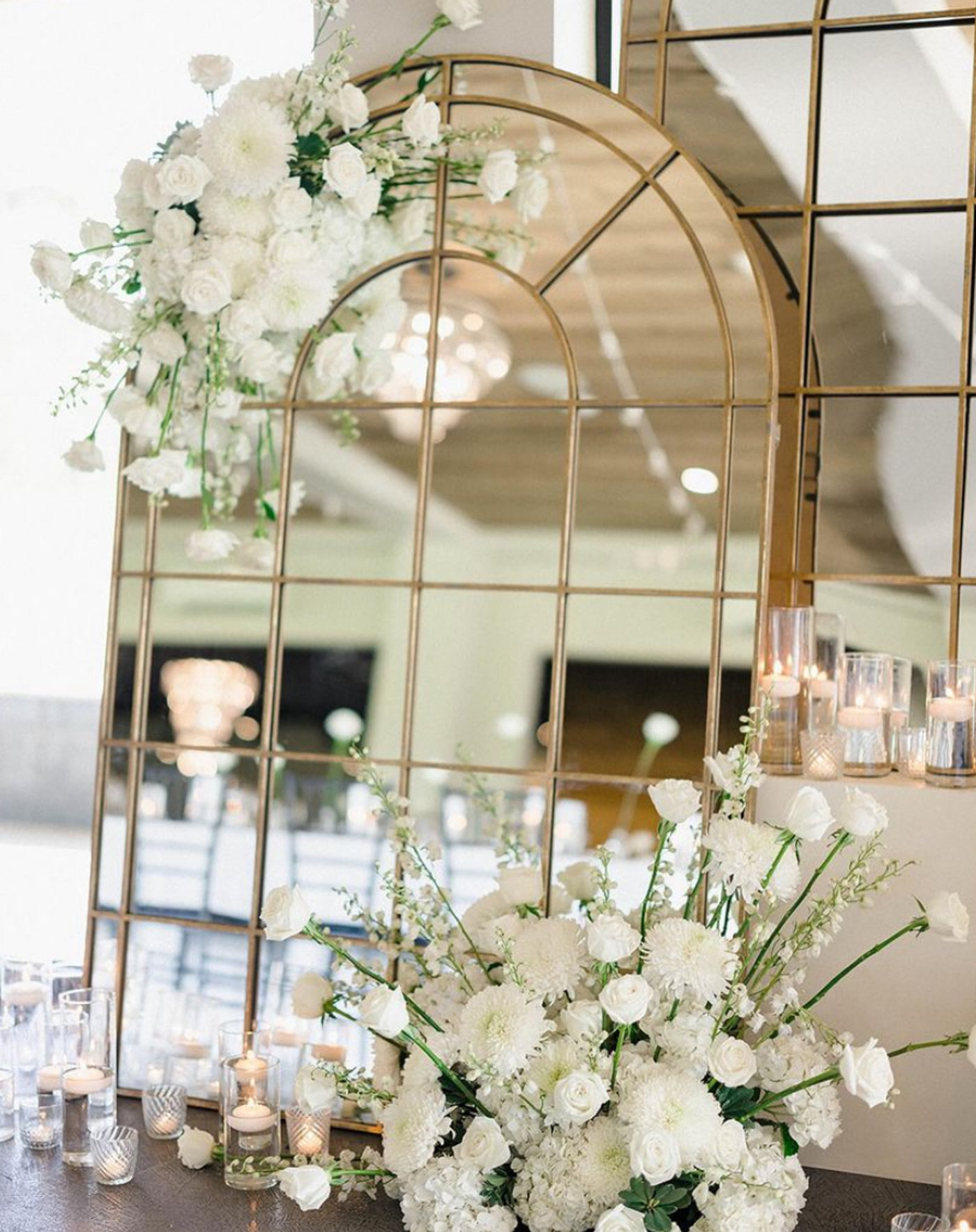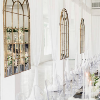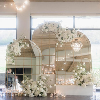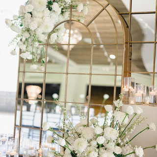 Add elegance and depth to your event with our Grantola Arch Mirror. Featuring a gold arched frame with grid detailing, this oversized mirror is perfect as a backdrop, behind a sweetheart table, or to enhance any lounge or entryway.