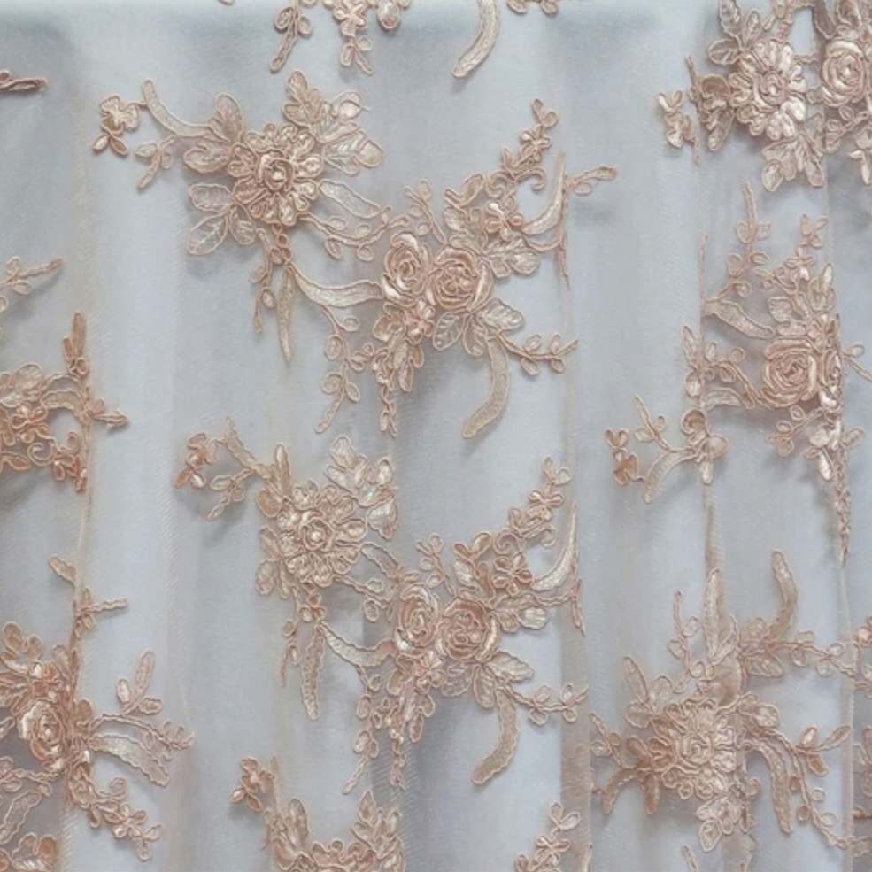 This designer material has a mesh/sheer base with a floral embroidery design. Underlay is recommended.