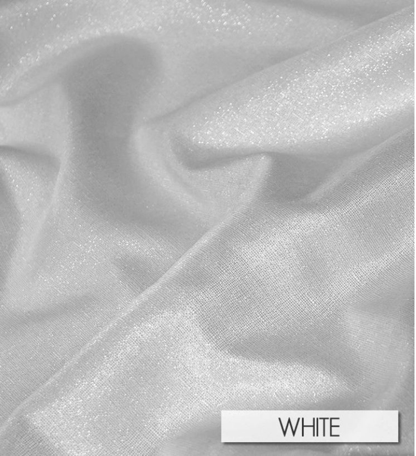 This specialty fabric is a Polyester base with metallic threads throughout.